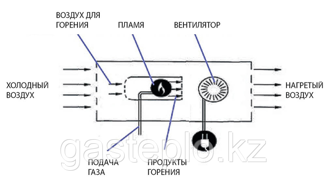Продукты сгорания смешиваются с нагреваемым воздухом и направляются в отапливаемое помещение для его нагрева.