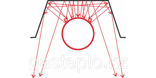 "Вдавленный" участок рефлектора KEYWARM над излучающей трубой отводит поток излучения, заставляя его огибать трубу и уходить вниз в обогреваемую зону.